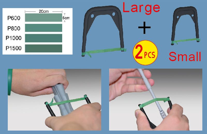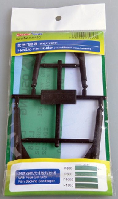 Portalima flessibile della serie MASTER TOOLS di TRUMPETER in plastica con 4 diverse strisce di carta vetrata (ciascuna 20×5 cm) nelle granulometrie P600, P800, P1000, P1500 per la facile e semplice rimozione e pulizia delle bave fuse su superfici rotonde o curve kit parti (come canne di armi e così via). Il set contiene sia un supporto più piccolo che uno più grande in plastica con il quale è possibile lavorare perfettamente parti di diverse dimensioni.
