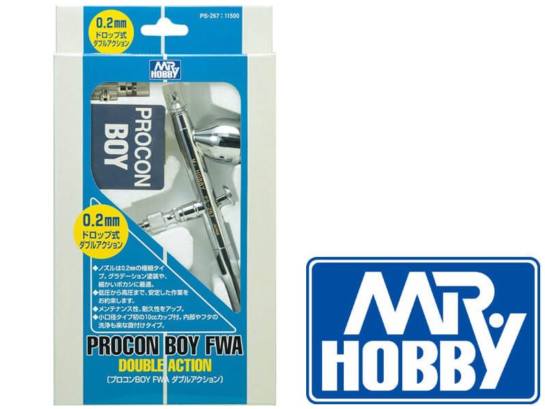 Mr Hobby Mr Procon Boy FWA è un aerografo a doppia azione orientato ai dettagli, alimentato per gravità, con un ugello da 0,2 mm. Come tutti gli aerografi Mr Hobby, è prodotto e rifinito secondo standard elevati e offre prestazioni eccellenti a un prezzo ragionevole.