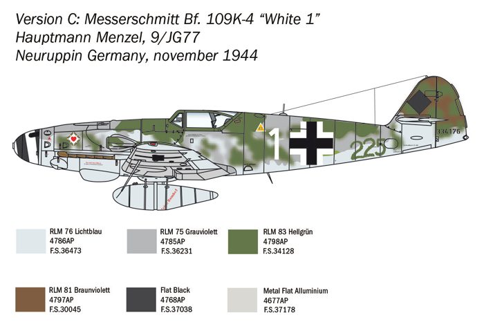 Il Messerschmitt Bf 109 è senza dubbio uno dei più celebri aerei da caccia della seconda Guerra mondiale e può essere considerato uno dei simboli della Luftwaffe. Nel corso del confitto è stato regolarmente migliorato in motorizzazioni ed armamento per cercare di essere ancora in grado di reggere il confronto con aerei più moderni e dalle prestazioni di volo elevate. Il Bf 109 K-4 Kurfürst, introdotto alla fine del 1944 e sostanzialmente derivato dal modello G, è stata l’ultima versione prodotte del famoso caccia tedesco. Era equipaggiato con un potente motore sovralimentato Daimler-Benz DB 605 da 2000 CV ed era in grado di superare i 720 Km/h potendo inoltre contare su un valido rateo di salita. Armato con un potente cannone da 30 mm MK108, installato nel mozzo dell’elica, e con due mitragliatrici MG 131 da 13 mm. sulla cappottatura del motore, quando era nelle mani di piloti esperti poteva competere alla pari con i più evoluti caccia alleati e sovietici.