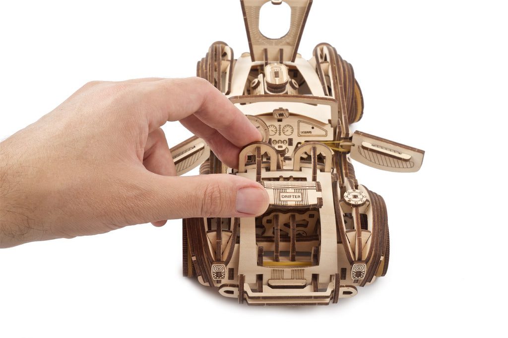 Spinta da un potente motore a molla metallica, l’auto da corsa Ugears Drift Cobra ha il motore più veloce sotto il cofano di qualsiasi modello meccanico in legno che conosciamo. Il modello è avvolto per mezzo di una manopola a cricchetto sotto il telaio. Prima di caricare il tuo modello di auto da corsa Drift Cobra, sposta il filtro dell’aria che sporge dal cofano verso il parabrezza e sposta l’interruttore davanti al sedile del passeggero in posizione di blocco (parallelo alla portiera). Ora ruota il cricchetto sotto il corpo dell’auto. Dopo 6 o 6,5 giri della manopola, la molla è completamente carica e — vroom!! — il tuo pilota è pronto a ruggire! Porta la leva del cambio, situata tra il sedile conducente e passeggero, nella posizione desiderata (Retromarcia, Folle, Guida). Per avviare il modello, appoggialo su una superficie piana, fai scorrere il filtro dell’aria in avanti e osserva il tuo Cobra stendere la gomma in una rotazione (inizia con le ruote girate da un lato), fare cerchi o accelerare lungo la pista in un retta.