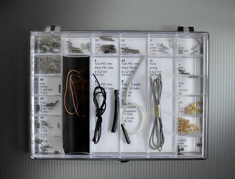 DECAL – MASKING STICKER – ACETATO – COFANETTO CON VITI E DADI, PELLE, FILO DI RAME, TUBO PVC, MOLLE ED ALTRE PARTI