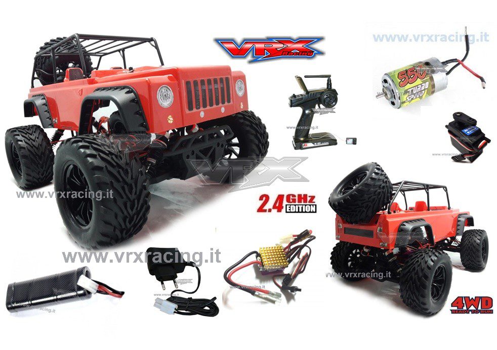 La VRX_ITALIA propone un nuovo modello a dir poco eccezionale. Stiamo parlando del modello JEEP brushed in scala 1/10. Appena proposto sul mercato è riuscito ad attirare l’attenzione degli amanti dell’ off-road. Senza limiti e dalla grande potenza si spinge la dove i suoi compagni della stessa categoria non riescono a dare il meglio. Impavida e scattante grazie alla sua elettronica e ad un treno di ruote formidabile capace di affrontare i terreni più sconnessi grazie alle sue dimensioni, ossia 130mm x 65mm. Dotato di un struttura portapacchi in metallo robusto posta sulla parte superiore della carrozzeria. La particolarità di questo modello è la ruota di scorta montata sulla parte posteriore da poter comunque utilizzare visto che è una vera e proprio ruote completa supplementare. La JEEP vrx è un modello professionale ideale per chi ha voglia e/o curiosità di provare un auto nuova e decisamente performante. Il modello JEEP è un moster RTR 4WD, della VRX, equipaggiato da: – Motore brushed RC-550 Turbo speed, – Regolatore di velocità ESC (electronic speed control) da 300A a tre funzioni autoprogrammabile, -Servo direzionale pronto e preciso nella risposta dei comandi. Il tutto alimentato dalla batteria Nimh da 1800 mah 7,2V. Sistema ricevente 2,4 GHz con Fail Safe integrato, che assicura l’arresto immediato del modello nel caso di perdita di contatto tra radio e ricevente; radio 2,4 GHz (nessun problema più di interferenze con altri modellisti!!!) a volantino con sistema proporzionale. Il modello è interamente montato con cuscinetti a sfera, su un innovativo telaio a vaschetta, protetto anteriormente e posteriormente da paraurti che assorbono anche gli impatti più violenti, con quattro ammortizzatori del tipo Big Bored (regolabili ad olio), assemblati su bracci più lunghi, che permettono una escursione maggiore in grado di “copiare” anche i terreni più sconnessi. La trasmissione integrale, a quattro ruote motrici, è a cardano, mentre sulla corona è presente un parastrappi regolabile, che non solo equilibra il movimento delle parti meccaniche ma attenua del tutto gli strappi evitando rotture. Le ruote anteriori e posteriori hanno dimensioni fuori standard e montate su trascinatori da 12 mm (una misura che permette di usare varie tipologie di ruote e marche). Ultimo ma non meno importante, c’è la possibilità di registrare la convergenza, la campanatura e l’ altezza dal suolo dell’avantreno, mentre sul retrotreno si possono registrare campanatura ed altezza dal suolo.