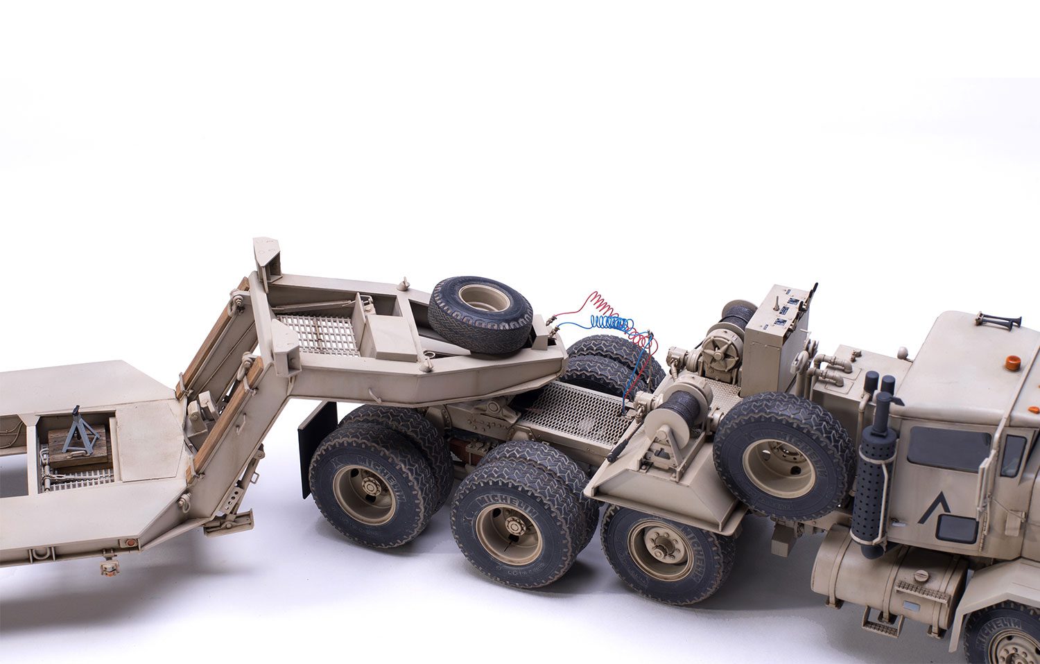 Il kit Meng SS-013 è un capolavoro di ingegneria composto da ben 843 parti. Il modello offre interni della cabina e del sistema di trasmissione completamente dettagliati, ruote anteriori sterzanti e rampe del rimorchio mobili. La qualità del contenuto è eccelsa, includendo parti in fotoincisione di precisione (PE), pellicole riflettenti per gli specchietti e maschere adesive per i cristalli della cabina. Alcune ruote sono collegate da assi in metallo per garantire robustezza alla struttura una volta assemblata.