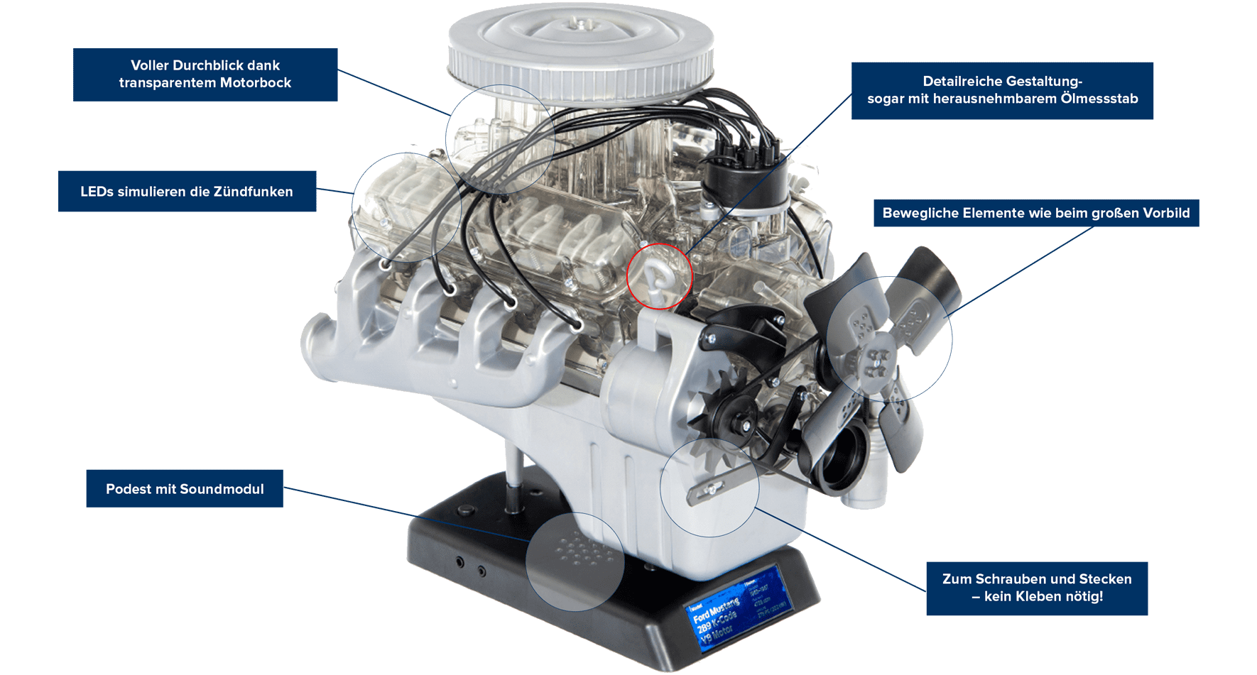In circa tre ore, le singole parti si uniscono per formare un modello dettagliato con cilindri mobili, albero motore e pistoni. I LED simulano le scintille di accensione nei cilindri. Il blocco motore trasparente rivela questa affascinante interazione. Un modulo audio integrato con il suono originale del motore dà vita al modello con la semplice pressione di un pulsante.