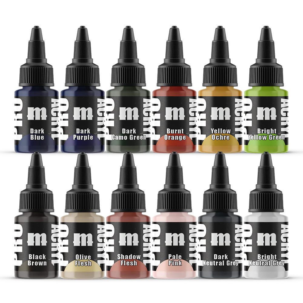 Monument Hobbies ha sviluppato la gamma Pro Acryl per rispondere alle esigenze dei pittori di miniature e modellismo statico più esigenti: colori acrilici con pigmentazione superiore alle gamme standard, formulati per offrire copertura, fluidità e controllo in ogni tecnica di pittura. I flaconi da 22ml — quasi il doppio dei barattoli da 12ml più diffusi sul mercato — includono agitatore in vetro e tappo anti-intasamento. Ogni colore funziona perfettamente sia a pennello che ad aerografo senza necessità di diluizioni complesse.