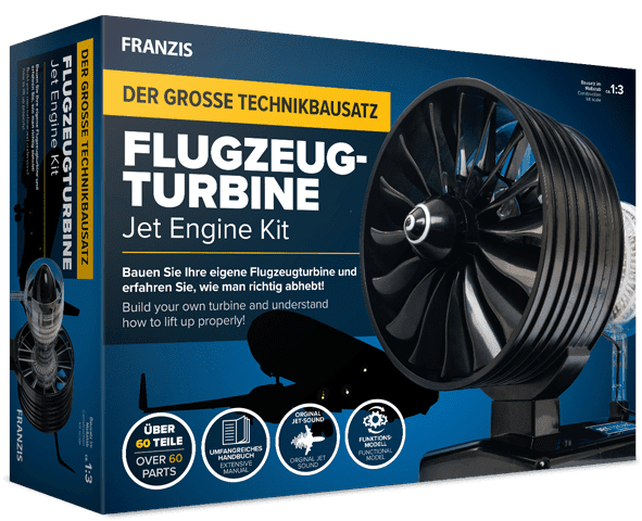 Sperimenta il tuo motore a getto d’aria in azione, motorizzato e perfettamente funzionante, e comprendi la tecnologia alla base! Kit da 60 parti – con modulo sonoro per il suono originale del jet – con manuale riccamente illustrato.