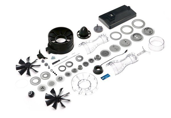 Con questo pacchetto, puoi costruire il modello funzionale trasparente di una turbina per aereo in circa tre ore. I punti salienti sono le sezioni di bassa e alta pressione, che si muovono a velocità diverse, e la camera di combustione illuminata.