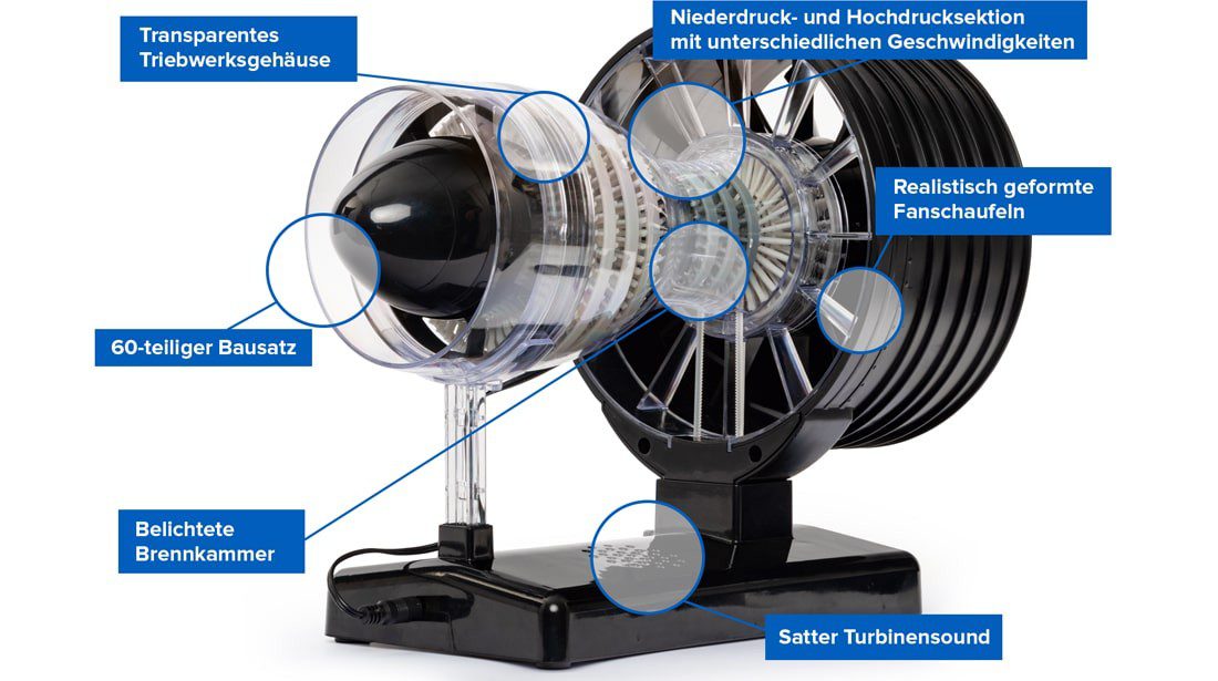 Con questo pacchetto, puoi costruire un modello funzionale trasparente di una turbina per aereo in circa due ore. Guarderai dietro l’affascinante tecnologia dell’aereo e scoprirai cosa porta nell’aria.